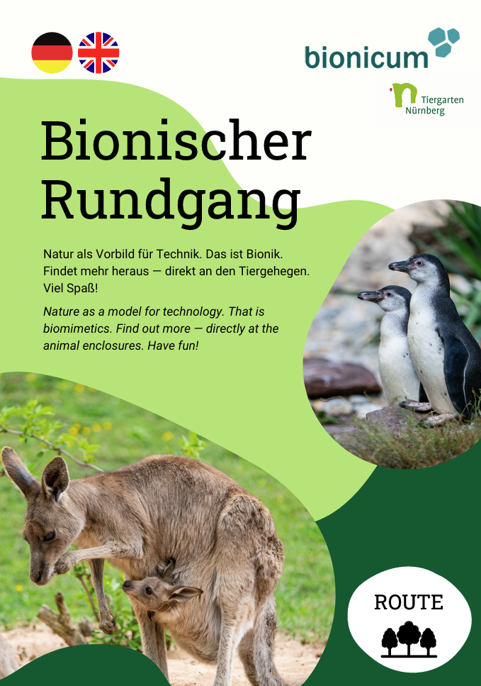 Der Bionische Rundgang ist eine Entdeckungsreise durch den Tiergarten Nürnberg. Mehr als 20 Stationen an den Tiergehegen können selbstständig während des Tiergartenbesuchs erkundet werden. Gerne bieten wir Führungen auf dem Bionischen Rundgang an und vermitteln ausgewählte Themen aus Natur und Technik zielgruppengerecht und anschaulich.